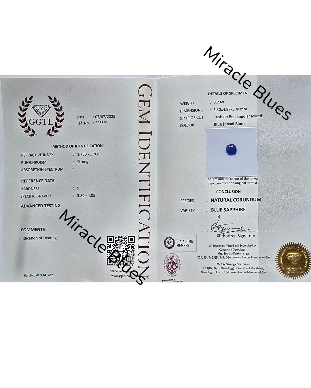 A vibrant 0.73 carat Royal Blue Sapphire, expertly cut in a cushion rectangular mixed style, showcasing rich, velvety royal blue tones. Heat-treated to enhance its natural colour and brilliance, this certified gem (5.30 × 4.87 × 3.40 mm) is perfect for custom rings, pendants, or fine jewellery designs.